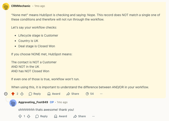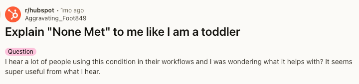 I recently came across this exact question on Reddit. Someone asked, “Can someone explain ‘None met’ to me like I’m a toddler?” I jumped into the comments to help clarify. But it got me thinking. If this many people are unsure about what “none met” does, it is probably a commonly misunderstood condition inside HubSpot workflows. So let’s break it down.